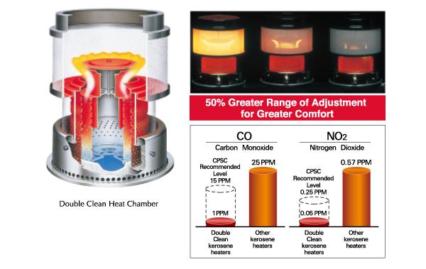 It results that the Double Clean heater reduces emission levels far below those of other kerosene heaters by the use of the Double Clean Heat Chamber. As the graph explains, CO emissions are reduced by up to 15 times – NO, by up to 5 times – compared to *CPSC recommend level. Only the Double Clean can claim the title as the world’s cleanest burning portable kerosene heater.